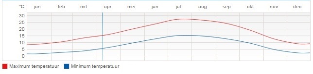 Het overzicht van de gemiddelde Maximum en Minumum temperaturen per maand: