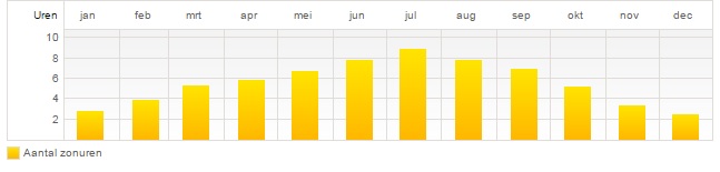 Het overzicht van het gemiddeld aantal dagelijkse zonneuren per maand: